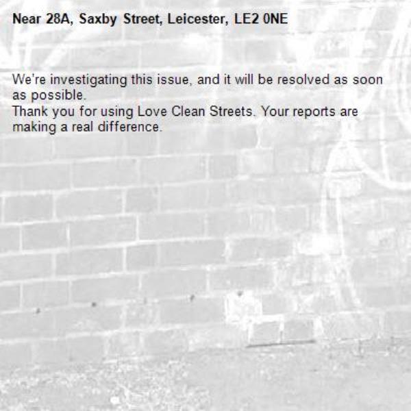 -28A, Saxby Street, Leicester, LE2 0NE 06/10/2025 12:18 We’re investigating this issue, and it will be resolved as soon as possible. Thank you for using Love Clean Streets. Your reports are making a real difference.
