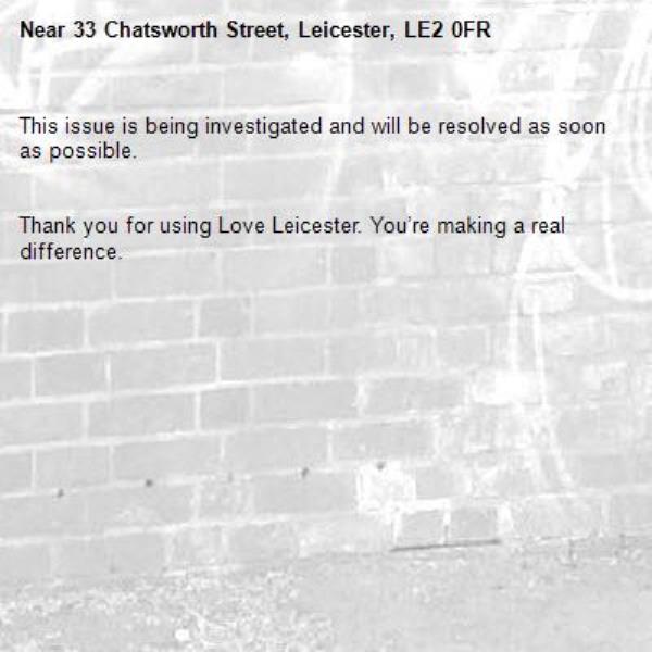 -33 Chatsworth Street, Leicester, LE2 0FR 04/10/2025 11:37 This issue is being investigated and will be resolved as soon as possible. Thank you for using Love Leicester. You’re making a real difference.