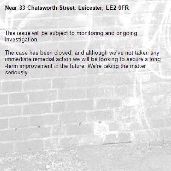 -33 Chatsworth Street, Leicester, LE2 0FR 06/10/2025 09:10 This issue will be subject to monitoring and ongoing investigation. The case has been closed, and although we’ve not taken any immediate remedial action we will be looking to secure a long-term improvement in the future. We’re taking the matter seriously.