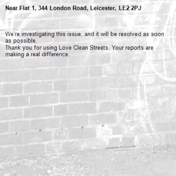 -Flat 1, 344 London Road, Leicester, LE2 2PJ 06/10/2025 12:03 We’re investigating this issue, and it will be resolved as soon as possible. Thank you for using Love Clean Streets. Your reports are making a real difference.