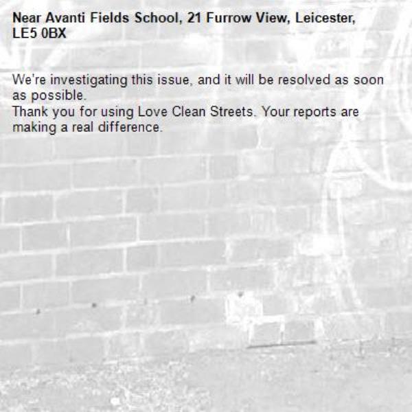 -Avanti Fields School, 21 Furrow View, Leicester, LE5 0BX 03/10/2025 08:17 We’re investigating this issue, and it will be resolved as soon as possible. Thank you for using Love Clean Streets. Your reports are making a real difference.