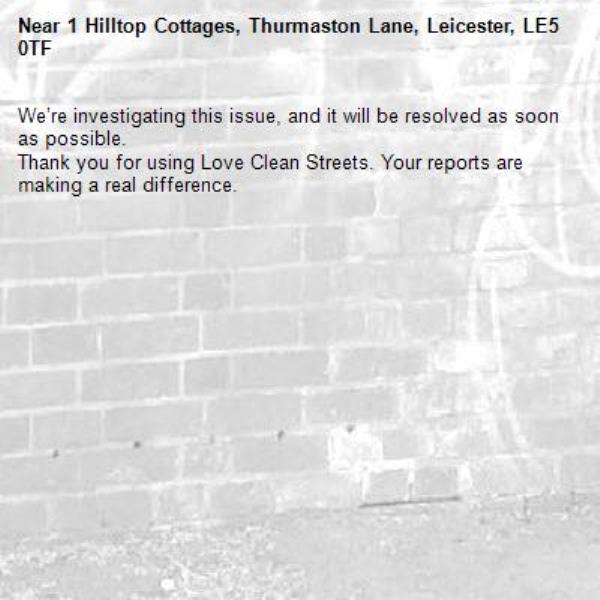 -1 Hilltop Cottages, Thurmaston Lane, Leicester, LE5 0TF 03/10/2025 08:28 We’re investigating this issue, and it will be resolved as soon as possible. Thank you for using Love Clean Streets. Your reports are making a real difference.