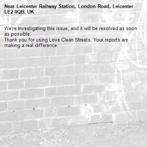 -Leicester Railway Station, London Road, Leicester LE2 0QB, UK 03/10/2025 07:55 We’re investigating this issue, and it will be resolved as soon as possible. Thank you for using Love Clean Streets. Your reports are making a real difference.