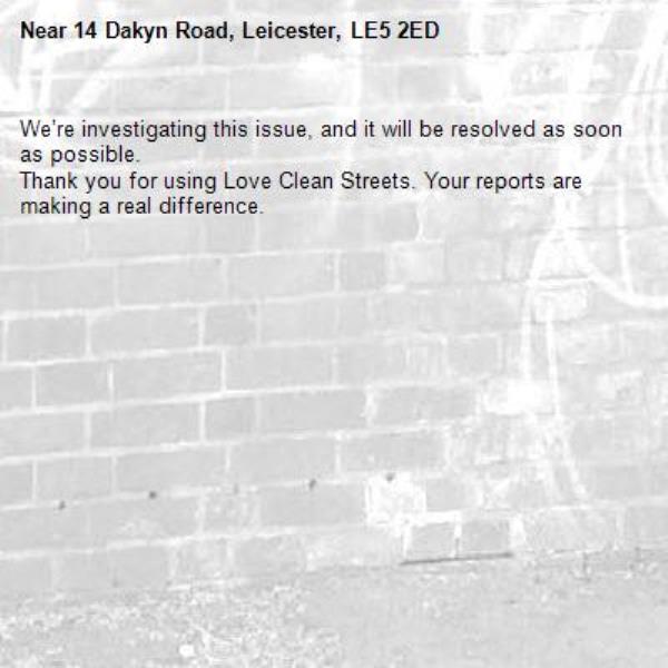 -14 Dakyn Road, Leicester, LE5 2ED 02/10/2025 15:36 We’re investigating this issue, and it will be resolved as soon as possible. Thank you for using Love Clean Streets. Your reports are making a real difference.