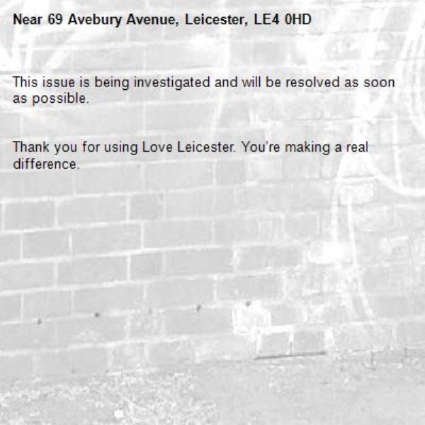 -69 Avebury Avenue, Leicester, LE4 0HD 04/10/2025 11:23 This issue is being investigated and will be resolved as soon as possible. Thank you for using Love Leicester. You’re making a real difference.